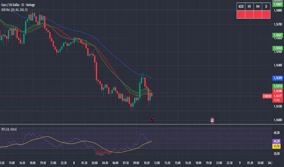 Based on the relations of bands to reference, price to reference and band direction this indicator caculates the trending direction of 4 alternative time frames. The timeframes can be changed in the settings of this indicator.