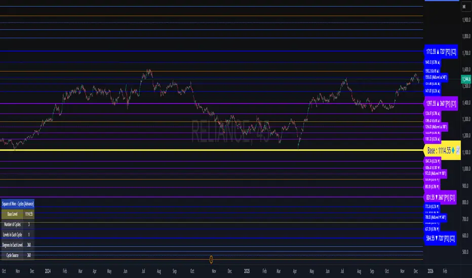 The Square of Nine Levels [RC] indicator is a powerful price-projection and level-mapping tool based on W.D. Gann’s legendary Square of Nine mathematical system. This indicator transforms market prices into geometric rotations and harmonic levels—revealing price zones where markets historically accelerate, pause, or reverse with uncanny accuracy.