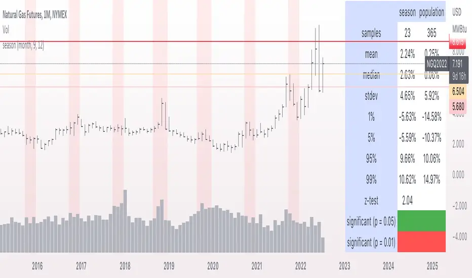 The "season" you select has a fixed length; for example, months eight through twelve has a length of four. This length is used to compute a sample mean, which is the mean return of all September-December periods in the chart. It is also used to calculate the mean/stdev of every other four-month period in the chart history. The latter is considered the "population." Using a Z-test, the script scores the difference between the sample returns and the population returns, and displays the results at two levels of significance (P = 0.05 and P = 0.01). The null hypothesis is "there is no difference between the seasonal periods and the population of ordinary periods". If the Z-score is sufficiently large or small, we can reject the null hypothesis and say that there is a seasonal effect at the given level of confidence. The output table will show green for a rejection of the null hypothesis (meaning there is a seasonal effect) or red of acceptance (there is no seasonal effect).