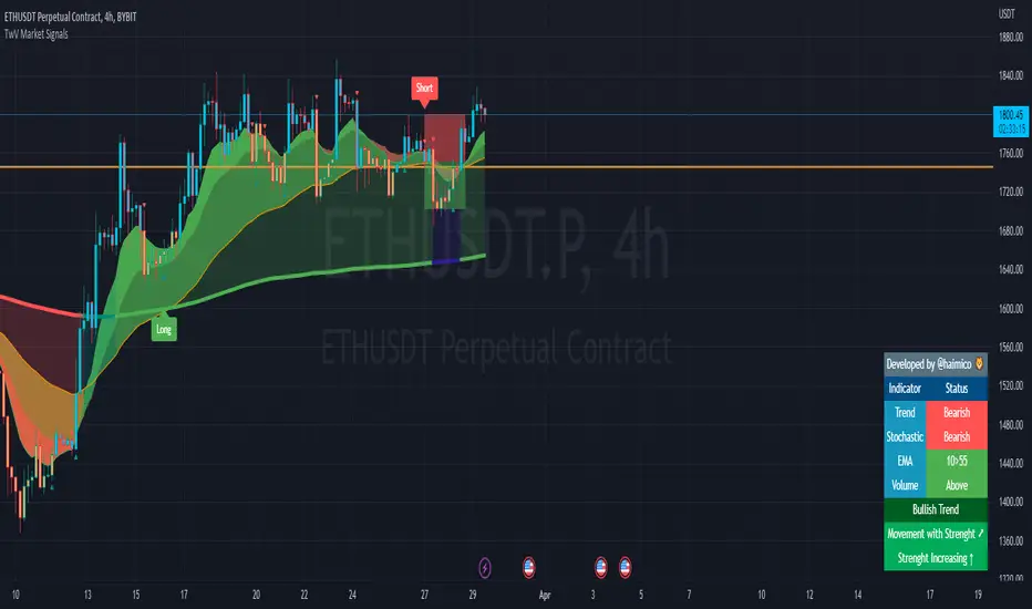The indicator draws Long and Short signals depending on the trend analysis. The indicators also use meaningful colors for traders to be able to visually understand the graphs, such us fillings on EMAs, so the possible trend is represented.