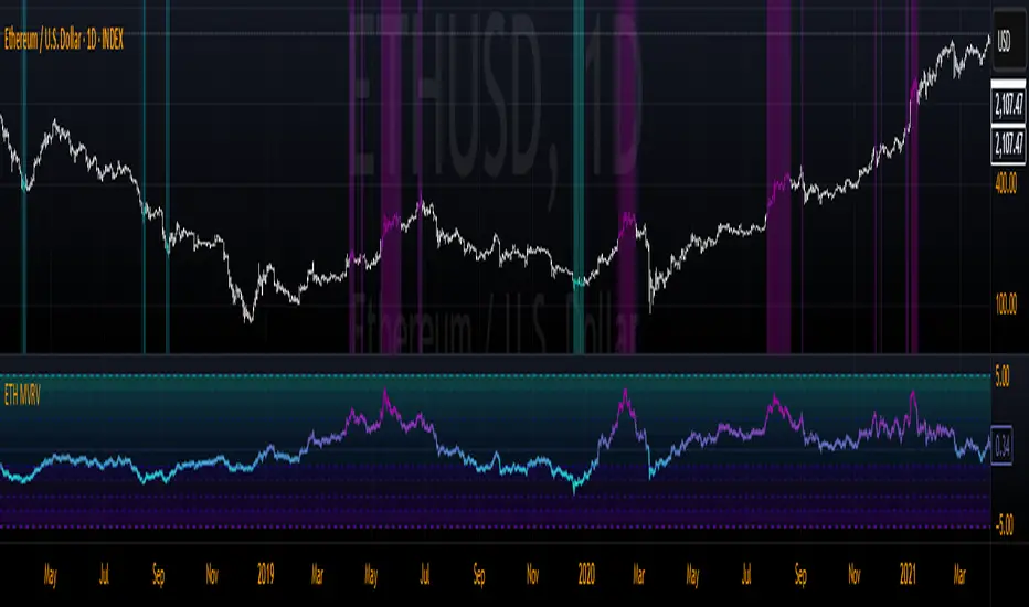 The indicator calculates the Z-score of the MVRV ratio over a user-defined lookback period, visually representing how far the current MVRV deviates from its mean in terms of standard deviations. It features customizable overbought and oversold thresholds, a gradient-based color system for easy interpretation, and optional chart coloring to highlight key market conditions. Horizontal lines and filled zones provide additional context for interpreting the Z-score levels, ranging from extreme undervaluation to extreme overvaluation.