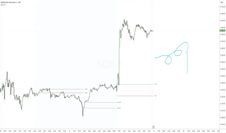 This indicator plots Opening Ranges (OR) for multiple trading sessions: Asia, London, and New York. It highlights the high (ORH), low (ORL), and midline of each session's specified duration, with customizable visuals including lines, fills, and labels. Designed for Futures, forex, stocks, or any market with distinct session times, it helps identify key support/resistance levels formed during session openings.Usage Tips