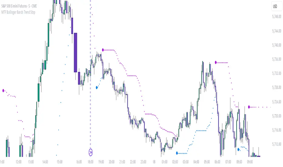 The "MTF Bollinger Bands Trend Stop" is an overlay indicator that uses multi-timeframe (MTF) Bollinger Bands to identify trends and provide dynamic stop levels. It helps traders follow trends and spot potential reversals by plotting a trend-following stop line and marking key breakout points on the chart.
