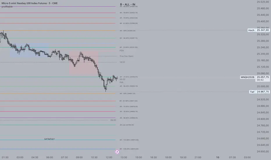 The indicator also includes time-based reference lines, session opens, and vertical time markers to support precise execution and timing. An integrated Adaptive Symmetrical Average Range (ASAR) projects expected price expansion levels from a defined session anchor, helping identify potential exhaustion or reversal areas.