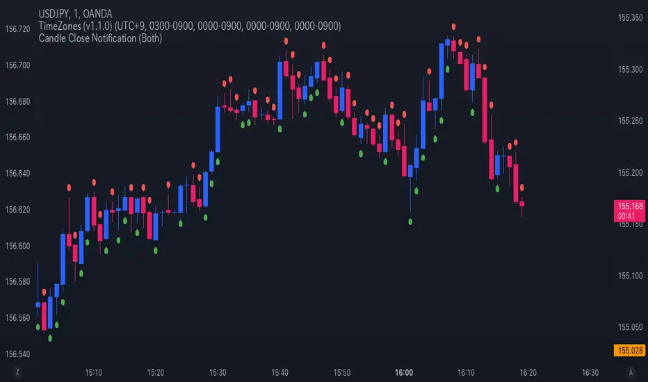 This indicator for TradingView sends notifications when a candlestick closes as either a bearish (red) or bullish (green) candle. It also marks the corresponding candles on the chart for visual reference.