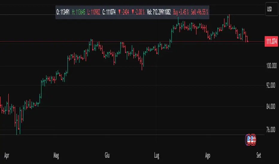 A compact, single-row horizontal table for TradingView displaying Open, High, Low, Close (OHLC), net change, percentage change, volume, and buy/sell pressure percentages. The table is fully color-coded for easy interpretation: green for positive values, red for negative, and yellow for neutral. Table position is fully customizable (top, middle, bottom / left, center, right). Ideal for traders who want a concise, real-time snapshot of price action and market sentiment in a single row.