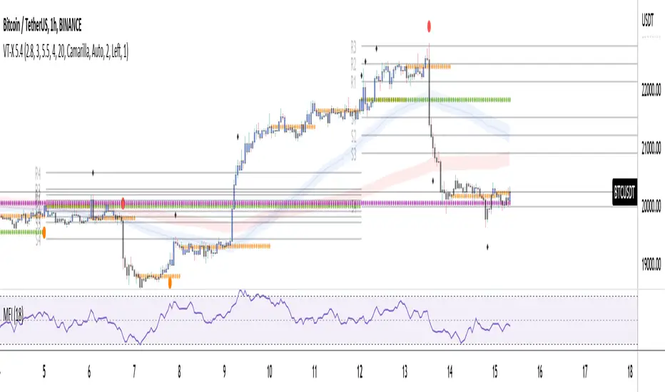 The uptrend and downtrend cicle signals are shown in a few different colors. Green and red are with the trend and have met all conditions. Orange and purple are against the trend calculations, and Olive circles risky trades against all the filters used to calculate signals.