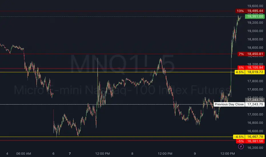 This indicator will show the Previous Day's Close and +/- 4.5% (Warning Level for Prop Firms), 5% (Prop Firm Trading Halted), 7% (First CME Circuit Breaker), 13% (Second CME Circuit Breaker), and 20% (Final CME Circuit Breaker All Trading Halted for the Day).