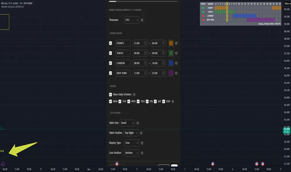 The 🐸 Market Sessions [APIDEVs] 👑 indicator is an advanced and highly customizable tool designed for traders who want to visualize and manage market sessions directly on their TradingView charts. With support for up to four configurable sessions (by default: Sydney, Tokyo, London, and New York), this indicator allows you to adjust times, time zones, day filters, and display styles to suit your trading strategy.