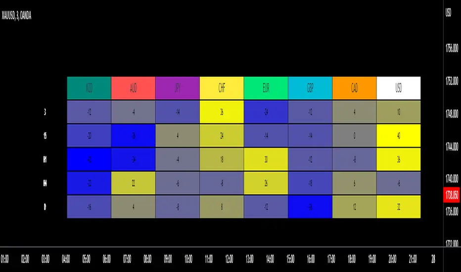 The above example is showing the direction of the 100 SMA for 30S, 3min, 15min, 1h, 4h, D for all the currencies. The base currency is adjusted so that the colour coding is adjusted to express the strength of the specific currency. For example in the case of CAD it is showing the directions of SMAs for CADNZD, CADAUD, CADJPY, CADCHF, CADEUR, CADGBP, CADUSD - the base currency is flipped on some pairs so CAD is always the base currency.