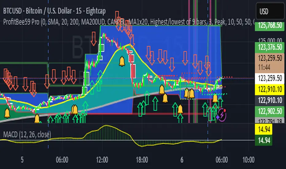 2. // Default settings: Fast(20), Slow(200), MACD(12,26,1), MA200UD wall, CAHCBL arrow, MA1x20 bell