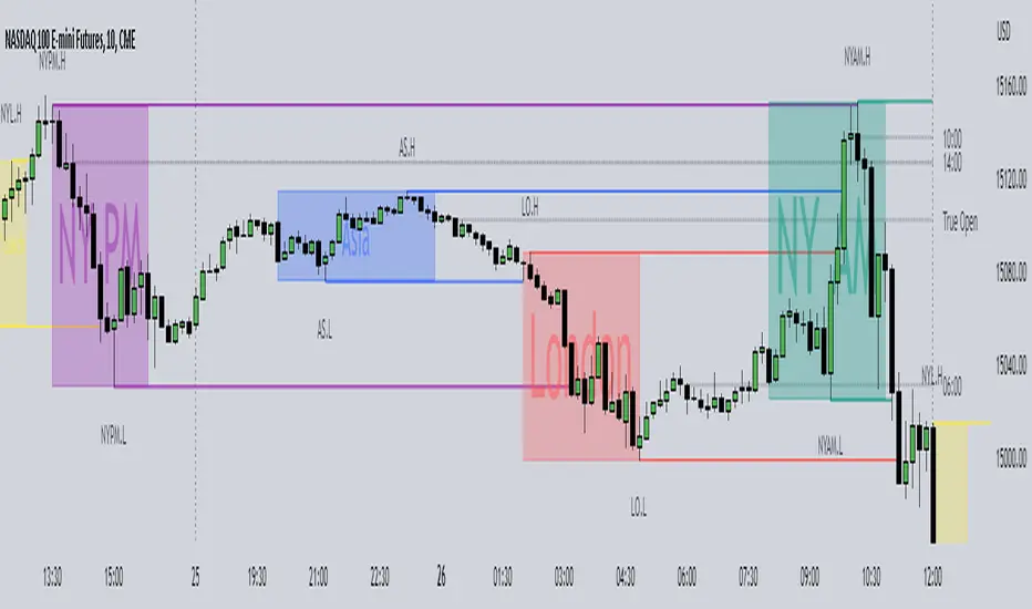 Designed with the help of TTrades and with inspiration from the ICT Everything indicator by coldbrewrosh, the purpose of this script is to identify ICT Killzones while also storing their highs and lows for future reference, until traded through.