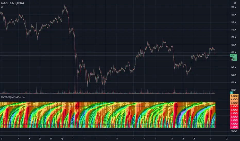 3D WAVE-PM is an (il)logical extreme adaptation of Mark Whistler's WAVE-PM script, originally published in his book Volatility Illuminated as a MetaTrader script. Instead of displaying WAVE-PM as several oscillator lines oscillating within a range, it plots 32 different period lengths at height equal to their length and reads out colors based on their value. The period lengths are spaced out such that it makes a relatively continuous heatmap when displayed on log scale. It has the same customization options as my regular WAVE-PM Meow Mix script.