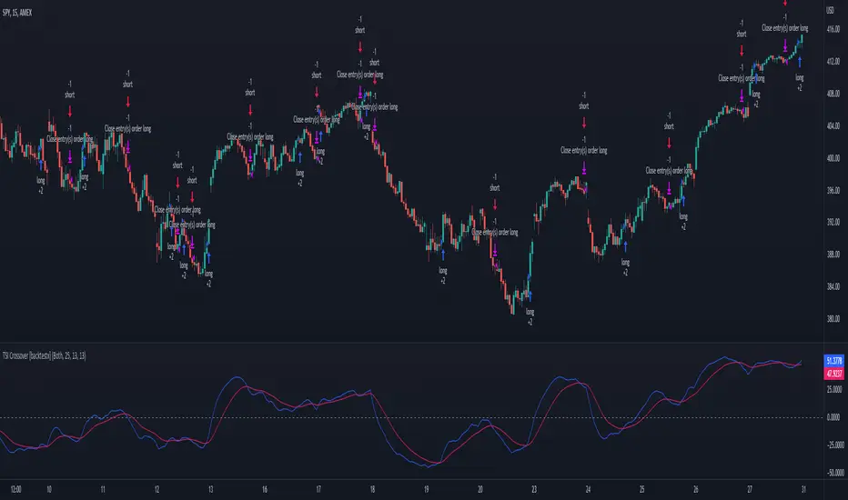 This strategy enters long when the TSI crosses over the signal line, and exits when it crosses under.