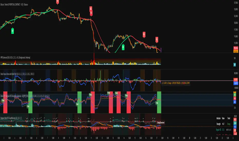 The **Regular-Delta RSI Gap Indicator** is a sophisticated momentum oscillator that compares traditional RSI with volume-based Delta RSI to identify trend strength and potential reversal points. This unique indicator combines price action with volume dynamics to provide enhanced market insights.