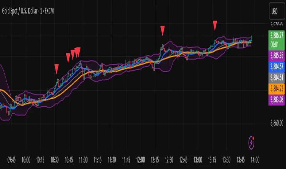 **Fadi Dynamic Trend Indicator (FDTI) - Version 2.0: Enhanced Dynamic Trend Analysis** We are pleased to introduce Version 2.0 of the Fadi Dynamic Trend Indicator (FDTI), representing a significant leap forward in trend analysis and the identification of potential reversal points in financial markets. This indicator has been completely redesigned to provide more dynamic and flexible insights, while maintaining its core objective of assisting traders in making informed decisions. **What's New in Version 2.0?** 1. **Advanced Dynamic Trend Detection System:** * Instead of relying on direct buy and sell signals, the new version offers a visual system for trend identification through **direct candlestick coloring on the chart**. Candlesticks are colored green to indicate a strong uptrend, red for a downtrend, and gray for neutral or sideways periods. This system is based on dynamic crossovers between two customizable moving averages (fast and slow), providing immediate and clear visibility into buyer or seller dominance. 2. **Enhanced Dynamic Price Channel:** * The static price channel concept from previous versions has been replaced with **Bollinger Bands**. This dynamic channel provides a price range that automatically adapts to market volatility, expanding during periods of high volatility and contracting during calmer phases. This allows traders to identify dynamic support and resistance levels more effectively, as well as monitor relative overbought and oversold conditions within the channel. 3. **Precise Potential Reversal Point Identification:** * To enhance the indicator's ability to identify reversal points, the **Relative Strength Index (RSI)** has been integrated. The indicator now displays clear visual signals (small triangles below or above candlesticks) when the price reaches overbought or oversold regions according to the RSI. These signals serve as early warnings for potential trend changes, giving traders an opportunity to assess the situation before making decisions. 4. **Greater Flexibility and Customization:** * The indicator's inputs have been improved to provide greater user control. You can now adjust the lengths of the moving averages, Bollinger Bands settings (length and standard deviation), and RSI overbought/oversold levels, allowing you to tailor the indicator to suit your trading style and any currency pair or financial asset. **How FDTI 2.0 Helps You:** * **Instant Trend Overview:** Candlestick coloring provides a quick glance at the prevailing trend. * **Identify Trading Zones:** The dynamic price channel helps define potential trading ranges. * **Early Warnings:** RSI reversal signals alert you to potential market shifts. * **Improved Trading Decisions:** By integrating these features, FDTI 2.0 aims to provide you with a comprehensive tool for market analysis and enhance the accuracy of your decisions.We believe this update will add significant value to your trading experience and help you navigate the markets with greater confidence.Protected script