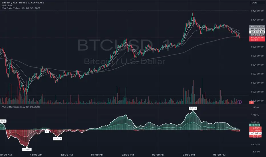 The MA Difference indicator shows 3 histograms representing differences in moving averages between a base MA (10) and 3 MA's: short (20), medium (50), and long (200). It also shows an exponentially weighted trend line which can indicate breakout opportunities, has alerts on all base <-> X crossovers, and shows potential consolidation zones where MA differences are below a user-defined tolerance.