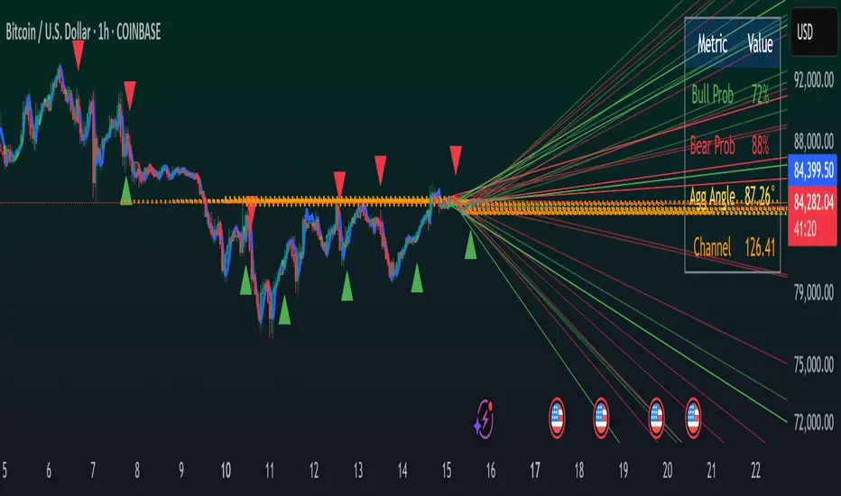This experimental indicator uses geometric trendline analysis combined with momentum and Monte Carlo simulation techniques to help visualize potential breakout areas. It calculates support, resistance, and an aggregated trendline using a custom Geo library (by kaigouthro). The indicator also tracks breakout signals in a way that a new buy signal is triggered only after a sell signal (and vice versa), ensuring no repeated signals in the same direction.
