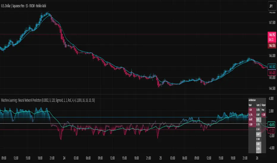 Since Pine Script does not support matrix operations, the backpropagation algorithm—necessary for neural network training—has been implemented entirely through scalar operations. This unique approach makes the creation of such a groundbreaking indicator possible.