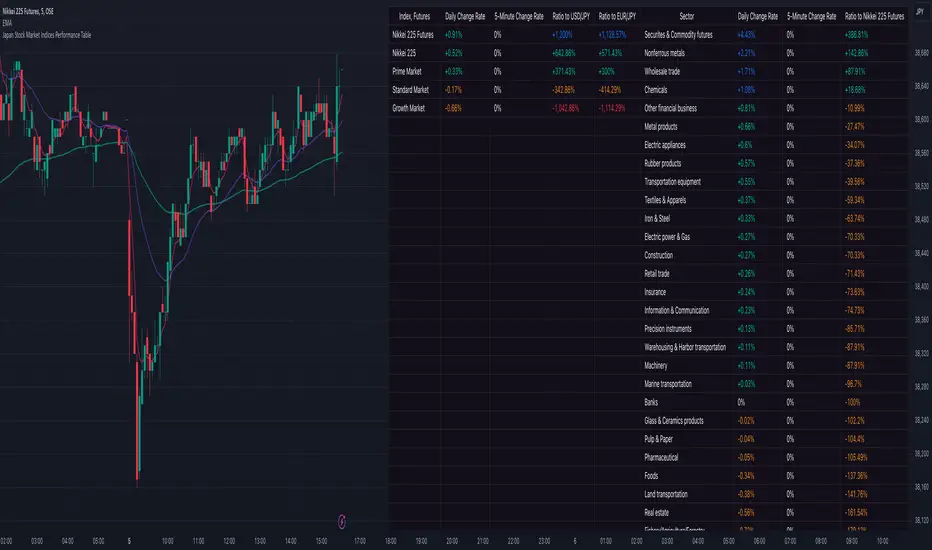 Since the Japanese stock market opens at 09:00 GMT+9, the values for Nikkei 225 Futures, USD/JPY, and EUR/JPY are also calculated based on their opening prices at that time. This script was created because, while brokerage apps allow you to see the comparison to the previous day's close for each index, they do not display the rate of change from the current day's opening price.