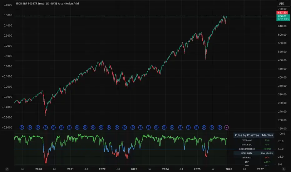 It outputs a percentage from 0-100% representing suggested equity exposure—a reading of 75% means 75% stocks and 25% cash/bonds. The indicator synthesizes five key market dimensions: Regime (trend strength and market structure), Risk (volatility and drawdown management), Valuation (P/E, equity risk premium, shareholder yield), Sentiment (VIX term structure and fear/greed dynamics), and Macro (yield curves, credit spreads, financial stability). Each factor is weighted and blended into a single actionable signal. A built-in Crisis Detection System automatically reduces exposure when multiple stress indicators trigger—including VIX spikes, rapid drawdowns, credit spread blowouts, and correlated stock/bond selloffs. The indicator classifies markets into six regimes: Strong Bull, Bull Market, Neutral, Correction, Bear Market, and Crisis. Four approach modes (Conservative, Balanced, Aggressive, Adaptive) let you match the signal to your risk personality. The on-chart dashboard displays real-time metrics including VIX, market drawdown, P/E ratio, equity risk premium, ROE, and individual component scores. Built-in alerts notify you of allocation threshold crossings, regime changes, and crisis events. Data is pulled automatically from SPY, VIX, Treasury yields, credit ETFs (HYG/LQD), TLT, gold, and dollar index. Eight color themes are included with dark/light mode support. Best used on daily timeframe for strategic allocation decisions.