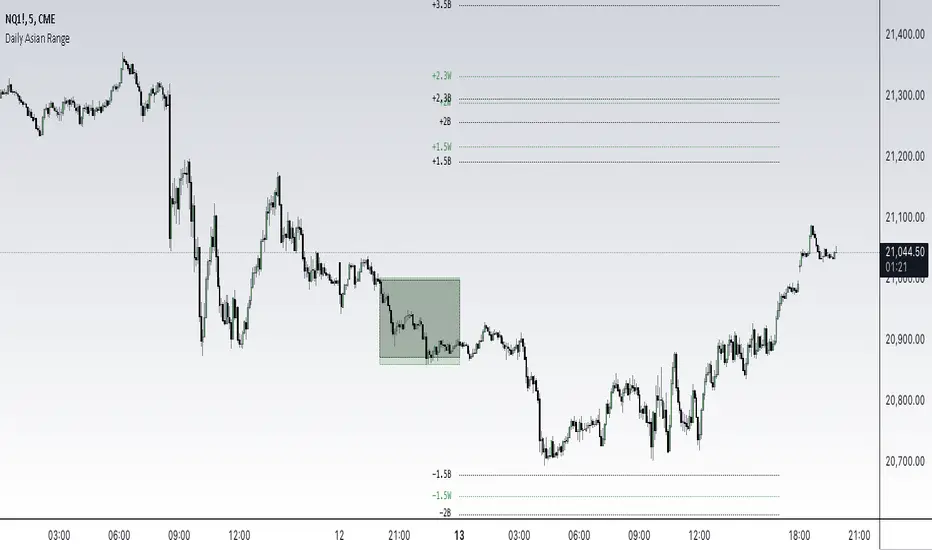 The Asian Range indicator identifies and visualizes potential liquidity areas based on price action during the Asian session (8:00 PM - 12:00 AM ET). It plots both body and wick ranges along with multiple standard deviation levels that can serve as potential price targets or areas of interest.
