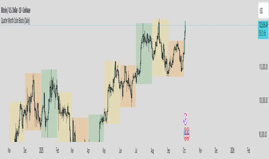 Three months make up a quarter. My indicator highlights each month in a distinct color: the first month in green, the second in yellow, and the third in orange. Each month functions as its own time window, where the algorithm may lean toward one side of the market more than the other. I like pairing this with Steve Moore’s seasonal tendencies for added context. This approach applies across Futures, Forex, and Crypto.