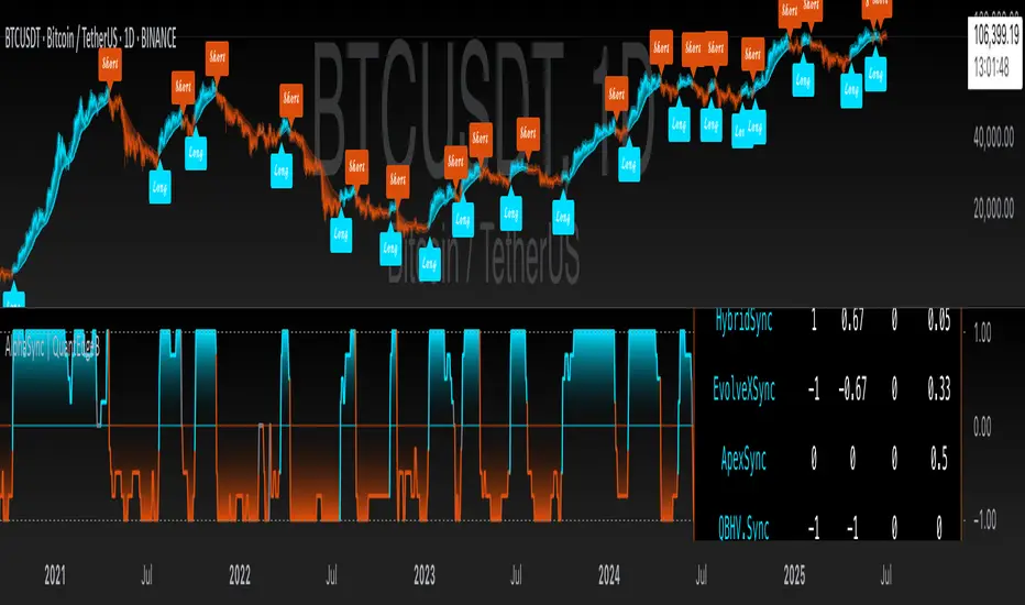 AlphaSync is a comprehensive medium-term market guidance system designed for major assets such as BTC, ETH, and SOL. This system helps traders determine the overall market direction by integrating three universal strategies (EvolveXSync, ApexSync, QBHV Sync) and a Hybrid strategy (HybridSync).