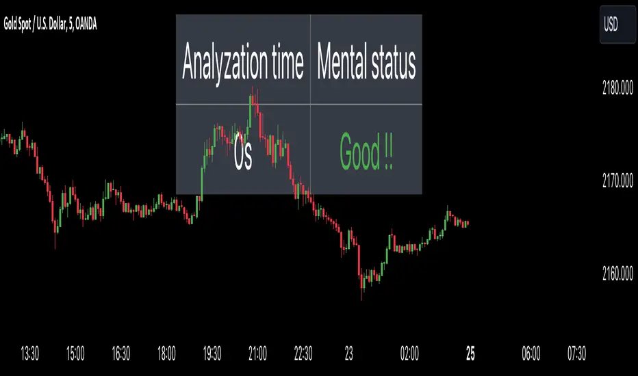 This indicator calculates and displays your analyzation time and give you alert about your current mental status to continue analyzing or close chart to avoid being manipulated my market.