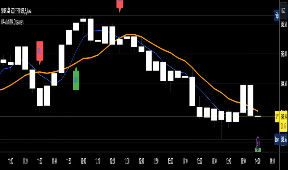 - Visual Cues: Plots the selected moving averages on the chart with distinct colors, and marks crossover points with buy/sell labels for easy identification.