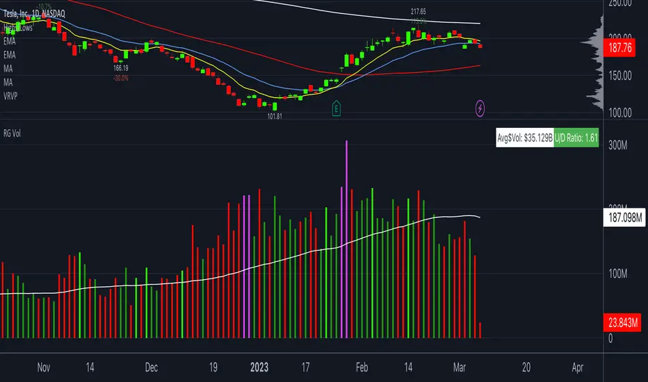 You have the option to change these colors in the settings. You can also toggle on or off the Moving Average, Pocket Pivots , Highest Volume Up Day, U/D ratio, and Avg $ Vol.
