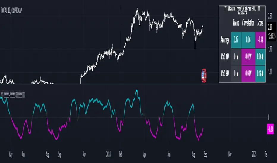 This script aims to determine the relationship between the user's selected ticker and the macro-market by examining data from Currencies, Bonds, SPX, GOLD, and Liquidity. The indicator evaluates the trends of different symbols and their connection to the chosen ticker to create an implied trend.