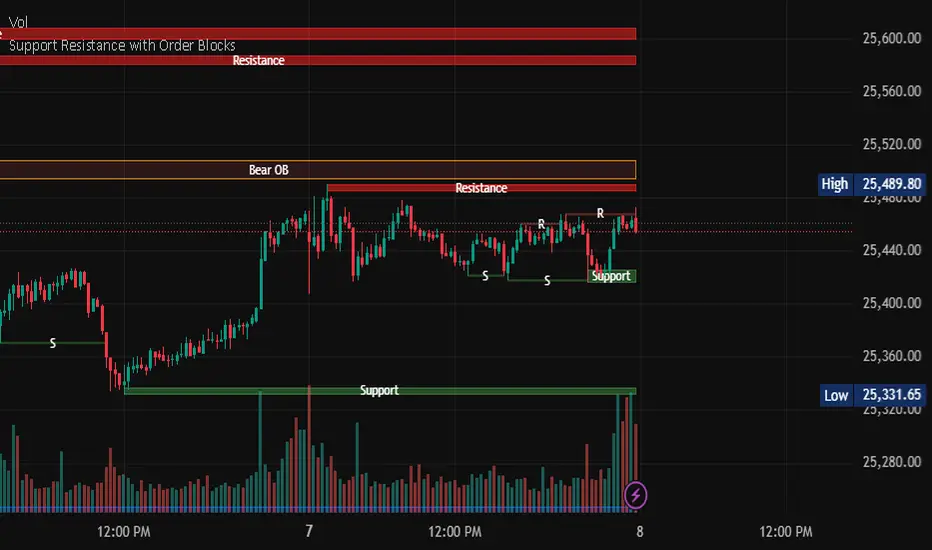 The Support & Resistance with Order Blocks indicator is a versatile Pine Script tool designed to empower traders with clear, actionable insights into key market levels. By combining advanced pivot-based support and resistance (S/R) detection with order block (OB) filtering, this indicator delivers clean, high-probability zones for entries, exits, and reversals. With customizable display options (boxes or lines) and intuitive settings, it’s perfect for traders of all styles—whether you’re scalping, swing trading, or investing long-term. Overlay it on your TradingView chart and elevate your trading strategy today!