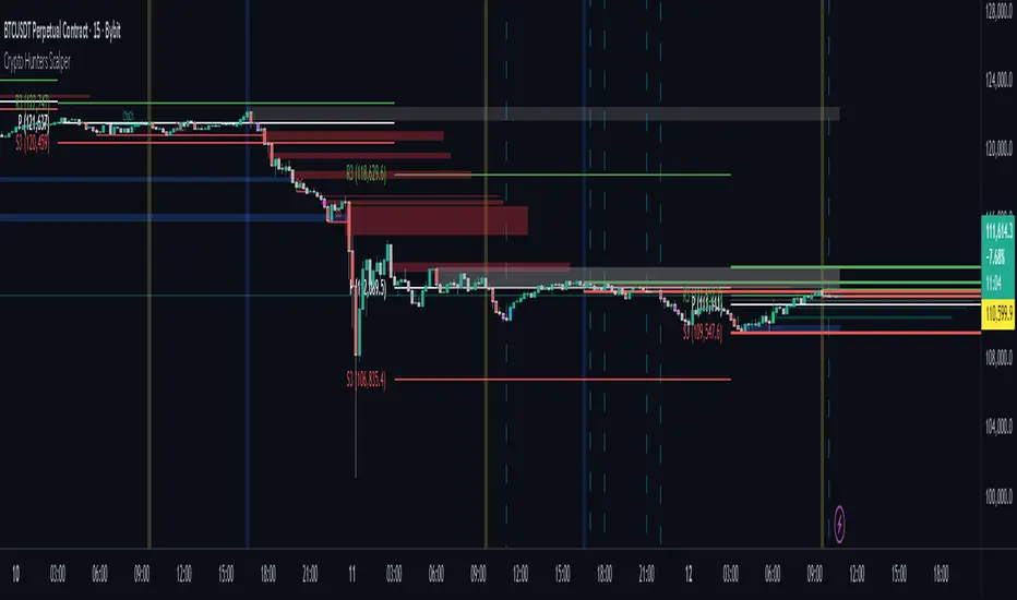 Индикаторът „**Crypto Hunters Scalper**“ е разработен за платформата **TradingView** и е предназначен за трейдъри, които използват технически анализ за търговия на финансови пазари. Той комбинира няколко основни функционалности: **Fair Value Gap (FVG)**, анализ на **15-минутни ключови свещи** в определени часове (по българско време) и отбелязване на **Silver Bullet** нива. Индикаторът е гъвкав, с множество настройки, което позволява персонализиране според нуждите на потребителя. Подходящ е за интрадей търговия на времеви рамки от 1 до 15 минути за скалп и от 1 час нагоре за суинг трейд.