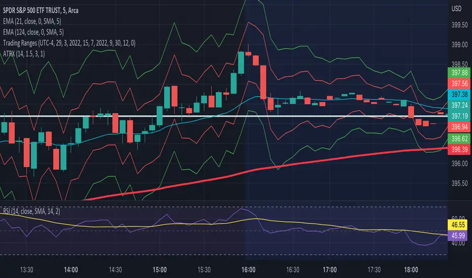 Simply set the multiplier, script will take the ATR for that time with whatever setting, multiply it with your input and plot that number plus and minus each candle close.