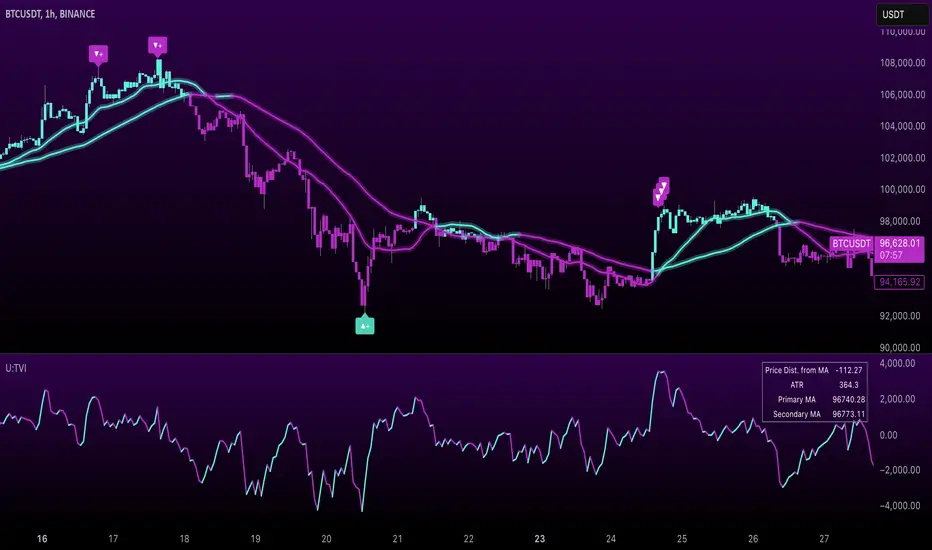 The "Uptrick: TrendVol Indicator," known by its abbreviated title 'U:TVI,' is meticulously crafted to offer traders insights into both trend strength and volume dynamics within the market. By visualizing trend strength relative to a moving average, analyzing volume activity, and assessing potential price movements, traders can make informed decisions and navigate the markets more effectively.