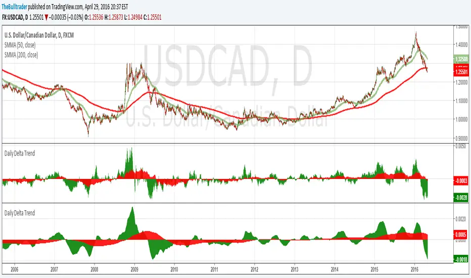 Daily Delta Trend is a useful exponential moving average of the 50 day and 200 day simple moving average. In the first Daily Delta Trend I realized that the simple moving averages were pretty choppy as they were buy then sell over short period of times. So I thought taking an average of another average would smooth my results and give it buy and sell signals more clearly. In chart 1, you can see that it is choppy, and in chart 2 is much smoother.