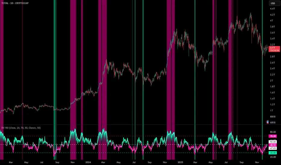 DV RSIThe DV RSI (Relative Strength Index) is a powerful and highly configurable technical indicator designed for analysts who demand both precision and control in their momentum studies. It combines the core Relative Strength Index (RSI) with a versatile Moving Average overlay and comprehensive visualization tools. It comes equipped with a dedicated Anti-Repainting Switch, which allows users to select the most appropriate calculation methodology for their analysis.