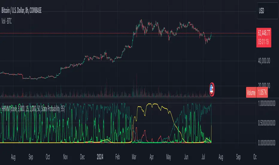 By default, the indicator displays the posterior probabilities, which represent the likelihood that the market is in a specific hidden state at any given time, based on the observed data and the model fit. These posterior probabilities strictly represent the model fit, reflecting how well the model explains the historical data it was trained on. This model fit is inherently different from out-of-sample predictions, which are generated using data that was not included in the training process. The posterior probabilities from the model fit provide a probabilistic assessment of the state the market was in at a particular time based on the data that came before and after it in the training sequence. Out-of-sample predictions, on the other hand, offer a forward-looking evaluation to test the model's predictive capability.