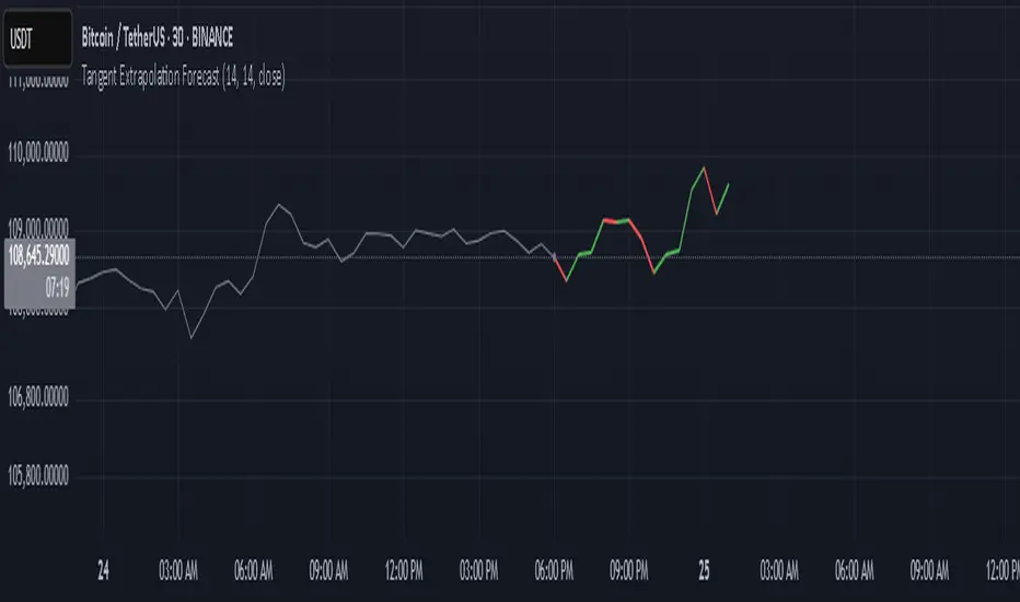 This indicator visually projects price direction by drawing a smoothed sequence of tangent lines based on recent price movements. For each bar in a user-defined lookback window, it calculates the slope over a smoothing period and extends the projected price forward. The resulting polyline forecast connect the endpoints of the extrapolations, and is color-coded to reflect directional changes: green for upward moves, red for downward, and gray for flat segments. This tool can assist traders in visualizing short-term momentum and potential trend continuity without introducing artificial future gaps.