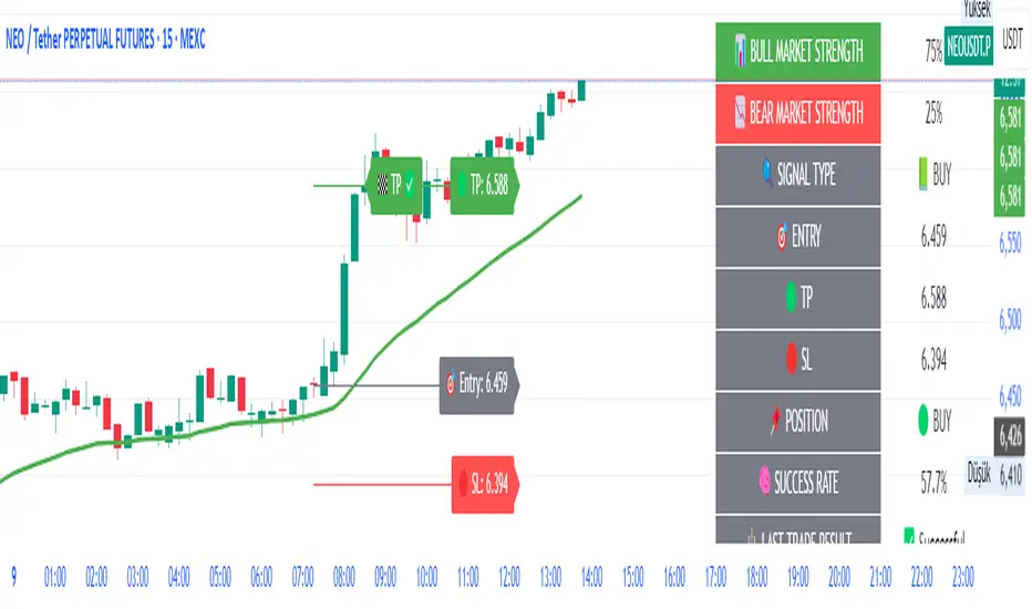 Table & Alerts: Displays market strength (% bull/bear), signal type, entry/TP/SL, and success rate in a table. Telegram alerts provide instant notifications.