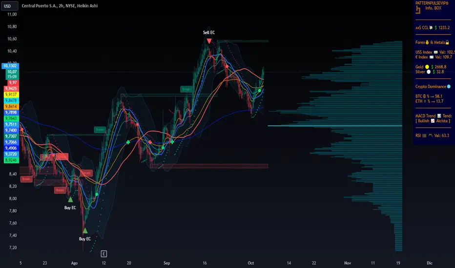 Esta función utiliza el MACD y el Estocástico para señalar posibles puntos de reversión en el precio. Los triángulos de compra y venta aparecen en el gráfico, indicando momentos clave en los que considerar entrar o salir de una posición.