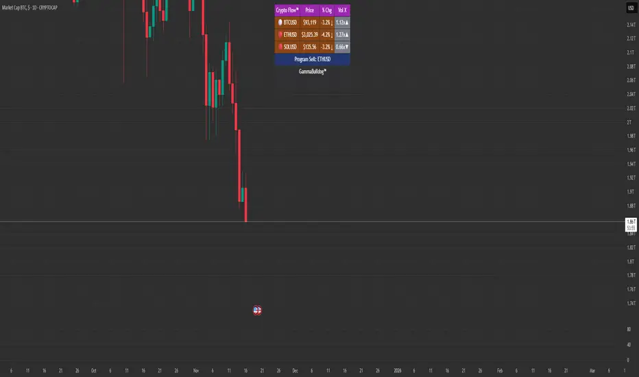Track BTCUSD, ETHUSD, and SOLUSD in real-time with a clean, mobile-friendly dashboard. See prices, percentage changes, volume multiples, daily movement circles, and a Program Buy/Sell row that highlights active buying or selling pressure.