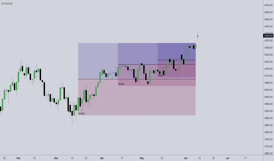 IPDA stands for Interbank Price Delivery Algorithm. Said algorithm appears to be referencing the past 20, 40, and 60 days intervals as points of reference to define ranges and related PD arrays.