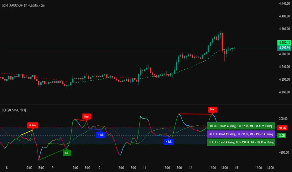 The Commodity Channel Index (CCI) is a technical indicator that measures the strength of the momentum in the market, it is calculated using a Moving average (default 20 SMA, users can change the legth and the type of the MA from dashboard) using formula: cci = (src - ma) / (0.015 * ta.dev(src, ccilength)).