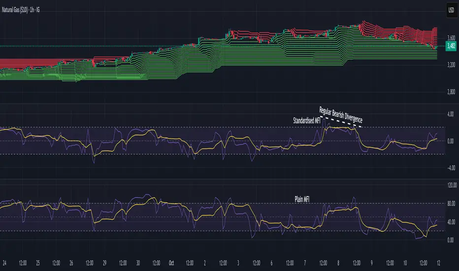 This custom Money Flow Index (MFI) script enhances the standard MFI by introducing multiple layers of configurability, statistical normalization, and visual clarity. It begins with the traditional MFI calculation using the average price, hlc3, and a user-defined length, then offers the option to standardize the output. Standardization transforms the MFI into a z-score by subtracting a rolling mean and dividing by a rolling standard deviation, making the indicator statistically interpretable across different assets, timeframes, and volatility regimes. When standardization is active, the overbought and oversold thresholds shift from the conventional 80 and 20 to +2 and –2, aligning them with standard deviation boundaries and improving signal clarity in volatile environments.