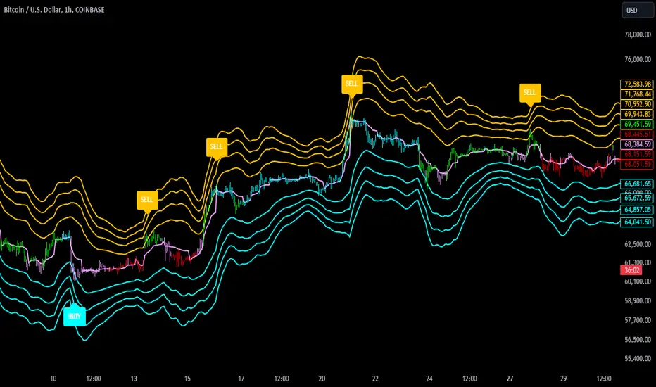 The script calculates bands around the VWAP (Volume Weighted Average Price) using the Average True Range (ATR) to adjust the levels according to market reality. Buy and sell signals are generated when the price crosses these bands.