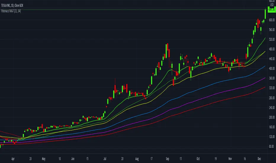 Fibonacci MA7 is a price indicator with 7 moving averages. It's inputs are based on the Fibonacci sequence 21, 34, 55, 89, 144, 233 & 377.