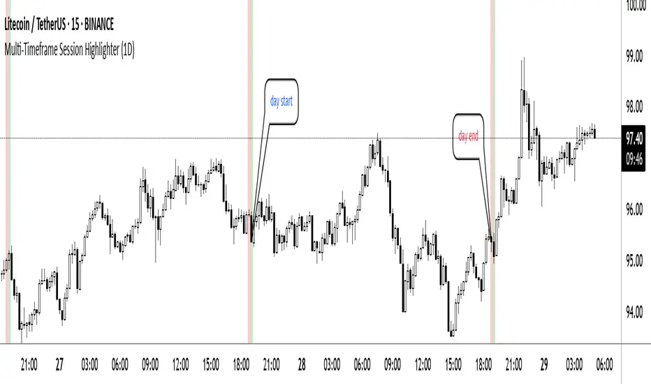 It’s a simple Pine Script indicator that paints two special candles on your chart, no matter what timeframe you’re looking at. Think of it as a highlighter pen for session starts and ends—can be used for session-based strategies or just keeping an eye on key turning points.