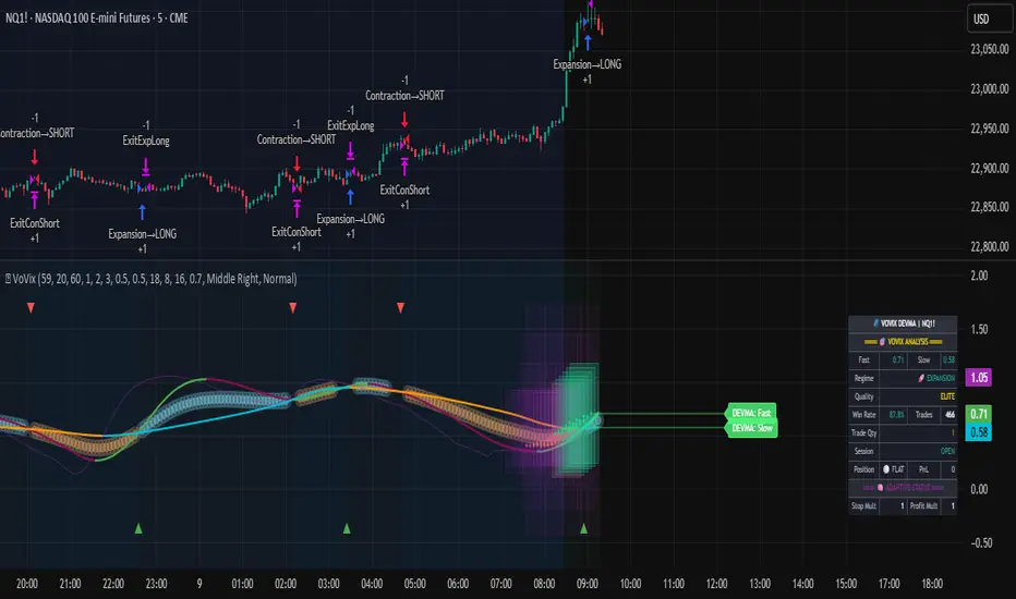 VoVix+ is an advanced analytical tool, not a guarantee of future profits. All financial markets carry inherent risk. The backtesting results shown by the strategy are historical and do not guarantee future performance. This strategy incorporates realistic commission and slippage settings by default, but market conditions can vary. Always practice sound risk management, use position sizes appropriate for your account equity, and never risk more than you can afford to lose. It is recommended to use this strategy as part of a comprehensive trading plan. This was developed specifically for Futures